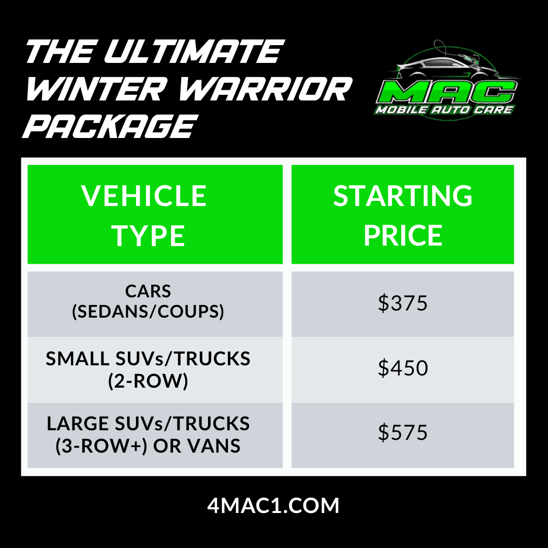 Winter-Grade Sealant Application: Long-lasting, hydrophobic Hybrid Polymer Sealant applied to all painted surfaces, guaranteed to repel water, salt, and slush for 3-6 months.